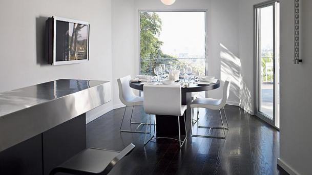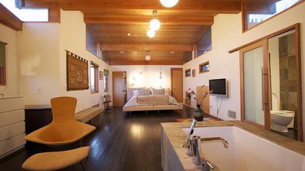 This apartment with nice shades of blue and a beautiful bathroom will help you to relax after work.